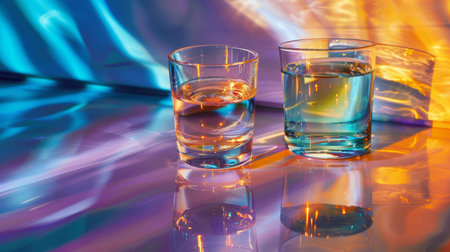 Two glasses of water reflect colorful light, creating a vibrant visual effect, showcasing modern design