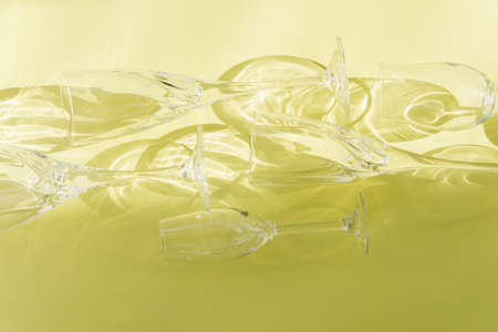 Empty glasses stand on a yellow background, top view. A beautiful creative still life filled with light with hard shadows and highlights from the glass. Sunlight is refracted through the glass.