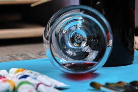 Colorful oil painting tubes, brushes and a glass of wine on dark table