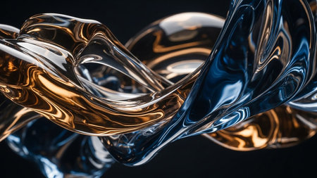 Intertwined abstract liquid forms in gold and deep blue with reflections against a dark background.