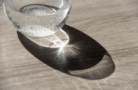 crystal glass with reflection on the table, abstract background, macro