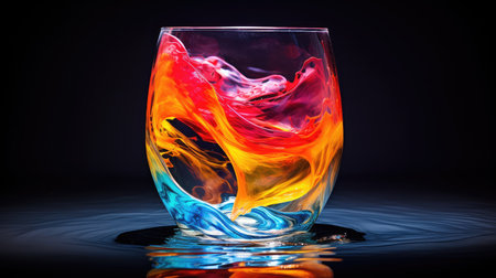 Colorful liquid in a glass with reflection on a black background.