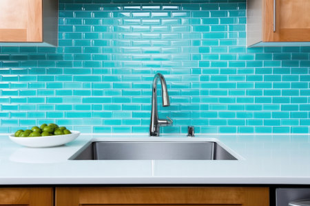 Modern kitchen with blue stained glass backsplash and stainless steel appliances. That the image is generated using AI.