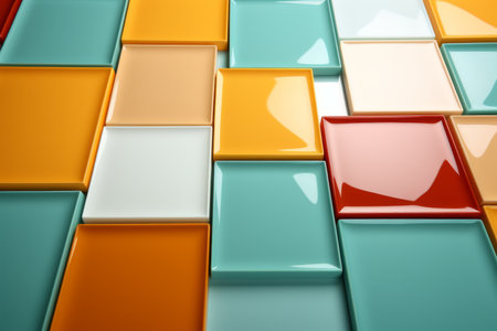 Layered, interlocking glass tiles with bright color accents in a clean, abstract arrangement.