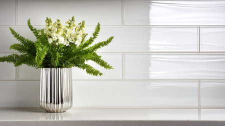 Decorative arrangement featuring a ribbed metallic silver vase filled with vibrant green fern fronds and a cluster of small white flowers, positioned on a light solid countertop. The background consists of horizontally oriented, rectangular white subway tiles that have a subtle, undulating or wavy glazed surface texture, creating soft reflections under bright lighting.