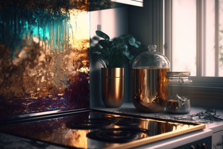 A kitchen filled with lots of bottles and jars. Generative AI image.