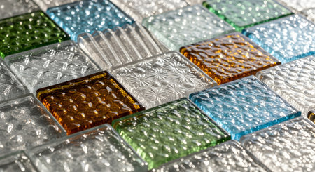 A detailed macro shot of various colorful and textured glass tiles arranged in a grid pattern. Sunlight illuminates the different patterns and hues of the tiles, including clear, green, blue, and amber, creating a vibrant background for interior design concepts.
