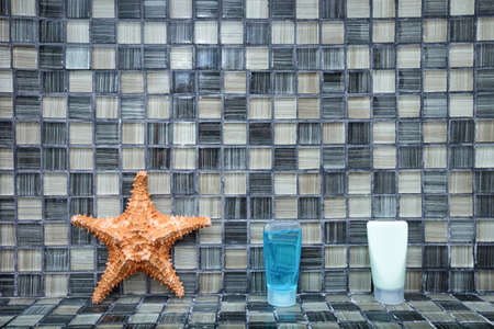 Starfish and tubes with shampoo on shelf in bathroom, nobody