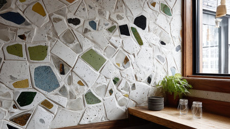 This image showcases a unique terrazzo wall composed of colorful fragments, enhancing a modern interior space. Natural lighting complements the aesthetic, creating a vibrant atmosphere.