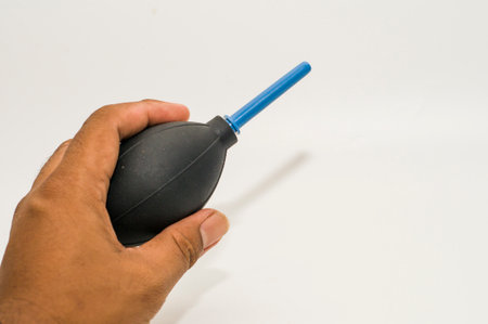 a hand of man hold dust pump for cleaning camera lense