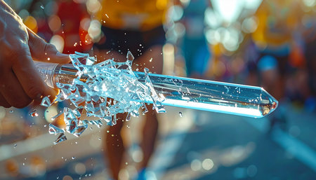 In a dramatic, high-stakes moment during a relay race, a runner's hand grips a glass baton just as it explodes into countless shards.