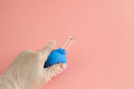female hand with French manicure in medicine glove holds and squeeze blue cosmetic medical jar for vacuum facial massage on pink background, latex or rubber and glass.