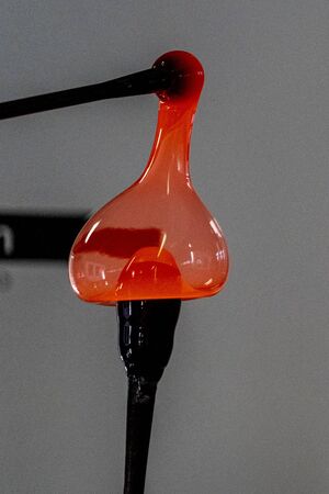 A close up selective focus shot on a molten glob of glass on the end of a blowpipe during the making of a blown lantern, with blurry glassmith.