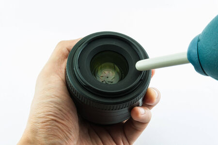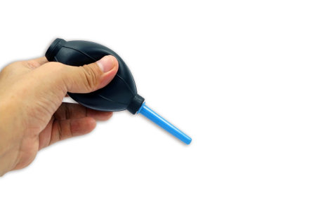 Camera lens cleaning blower in hand isolated on white background closeup.