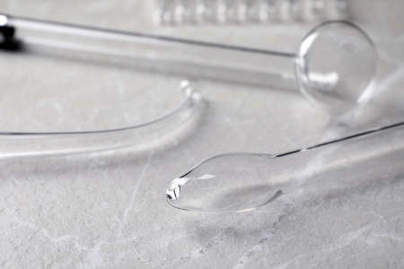 Flask and filter funnel on gray textured table, space for text. laboratory glassware
