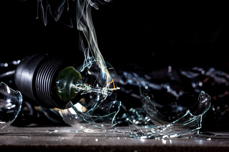 amazing explosion of a burning light bulb with splinters and smoke on a black background with a flash