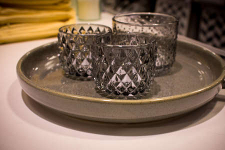 Abstract background of many empty glass of water placed on a table prepared for guests to dining in restaurant. Shallow depth of field in rows.