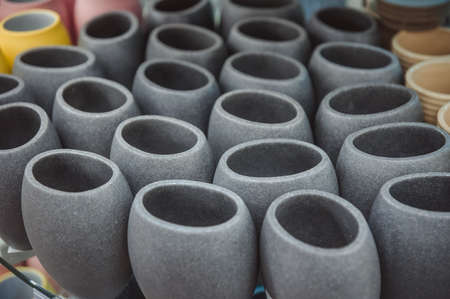 Ceramic products for hygiene products or food. Containers, bowls and vases made of stone are on a shelf in the workshop