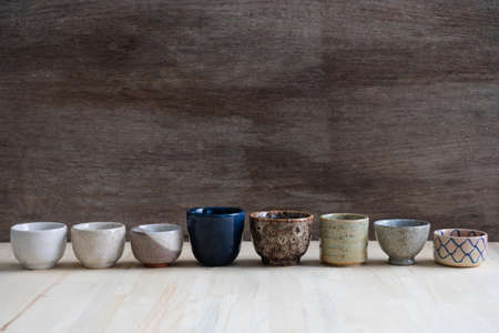 Colorful ceramic cups on wooden table, Thailand. Selective focus.