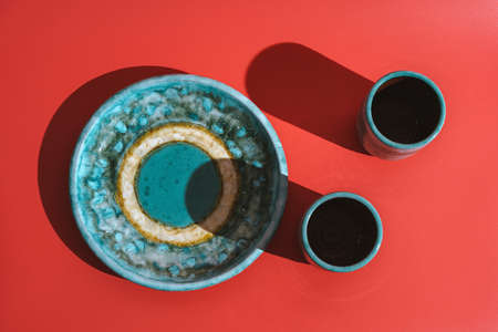 Handmade ceramic plate with two mugs on bright red background with strong shadows