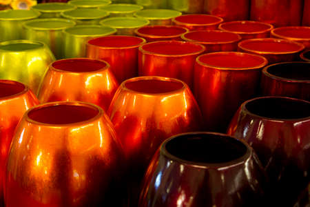 Many colorful ceramic hand made cups, top view. Handmade craft