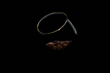 Coffee cup and coffee beans on black background. black coffee in a double-bottomed glass.