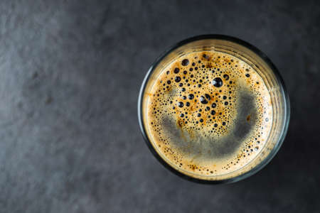 Close up top view of espresso coffee with beautiful crema in small glass.