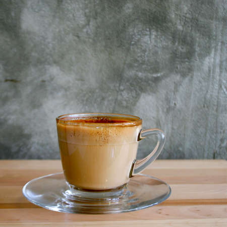large transparent glass filled with of aromatic Turkish coffee photographed on the isolated gray