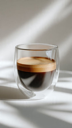 Top-down view of a glass coffee cup with crema, placed on a monochrome studio backdrop with strong lighting contrast