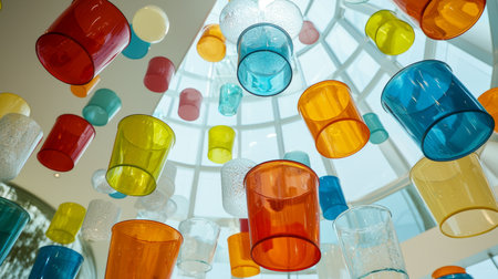 A captivating display of colorful cups hanging gracefully in a modern architectural space, filled with natural light, creating a vibrant and cheerful atmosphere.
