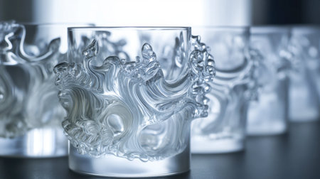 Crystal-clear drinking glasses with intricately sculpted designs that seem to dance as light hits the surface.