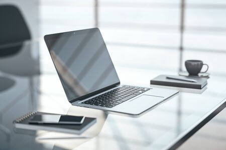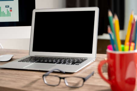 Modern workplace with open blank screen laptop and office supplies with mock up frame
