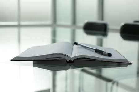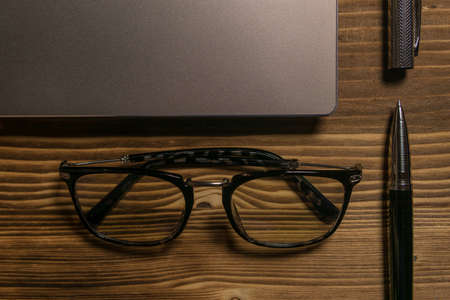 Notebook, laptop, glasses and pen on the table. Concept of business or study.