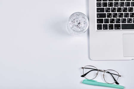 White office desk table with laptop, smartphone, notebook, and glass. Top view with copy space, flat lay.