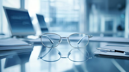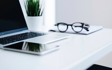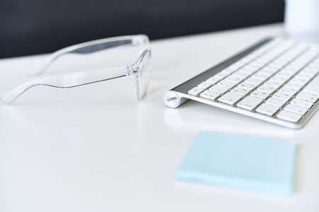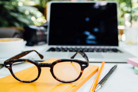 eyeglasses, computer, notebook on office desk. business, workplace, education concept. selective focus.