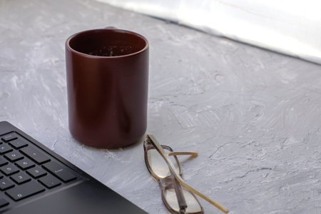 Wooden table with laptop, coffee cup, stationery and eyeglasses in home office room