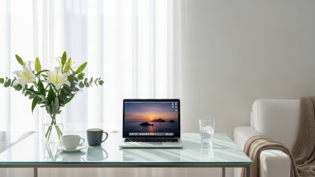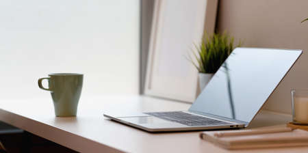 Laptop computer with coffee cup and office supplies in comfortable workplace near the windows with decorations