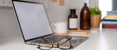 Side view of home office desk with mock-up laptop, glasses, cup and decorations on white table