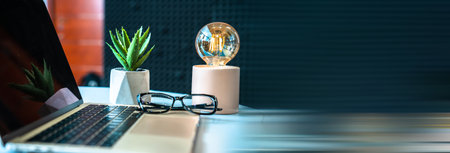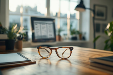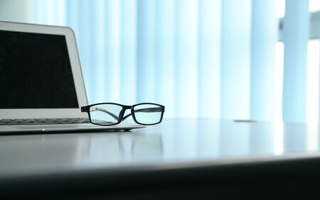Office table with notebook laptop and reading glasses. Window blinds at the background.