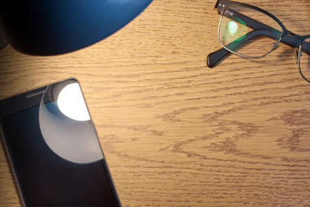 Top view of mobile phone and glasses on wooden desktop, concept of working from home, office or study place at home.