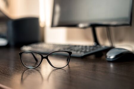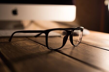 Glasses for sight and vision correction and protection from computer on the wooden table