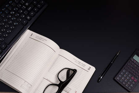 Black desk office with keyboard, calculator and other work supplies. Top view with copy space for input the text. Designer workspace on desk table essential elements on flat lay. Place for an inscription. . High quality photo