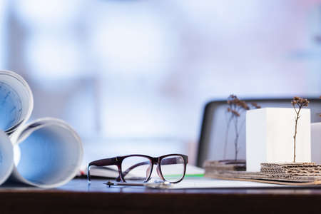 selective focus of eyeglasses near rolled blueprints on desk in office