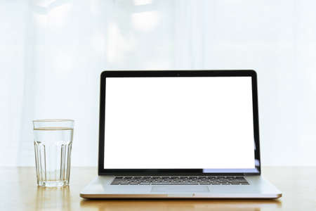 Isolated laptop computer screen with clipping path. Simply and modern home working space concept for modern working lifestyle and heath care people. Mineral drinking water on the table with laptop.