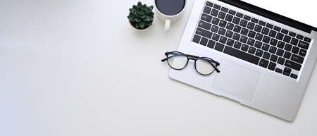 Horizontal photo of computer laptop, glasses, coffee cup and copy space on white background.