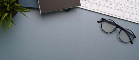Above view of stylish workspace with keyboard, notebook, glasses and copy space on dark blue background.