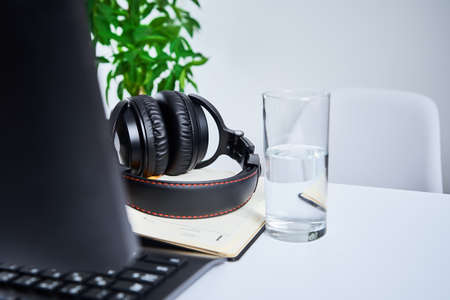 Remote workplace for freelance work, Online education at home, Table woth computer monitor, keyboard and headphones