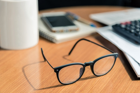 Glasses, mobile phone, calculator and coffee cup on office table.Selective focus on glasses
