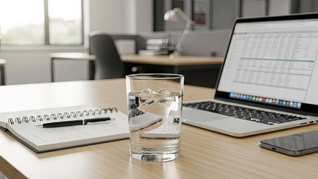 Drinking Glass On Desk And Woman In Foreground Using Computer