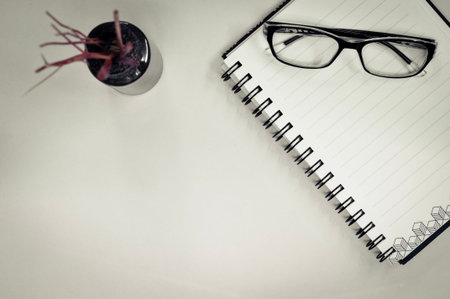 Top or flat lay view of eyeglass and notebook with flower decoration on white table background with copy space.